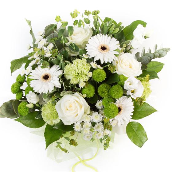 Vibrant limes and whites contrast to make this stylish hand-tied bouquet presented in a gift bag.