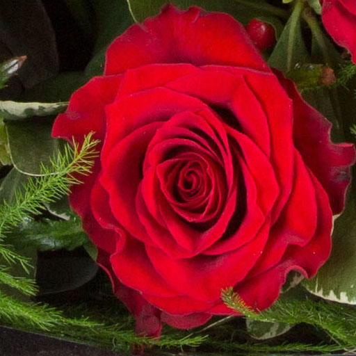 A hand-tied aqua bouquet of six sumptuous roses encased in a selection of greenery and berries.