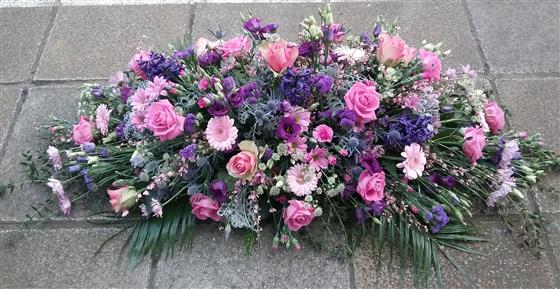 A very soft, delicate arrangement of pink & purple seasonal flowers.