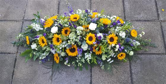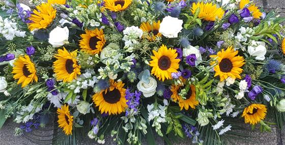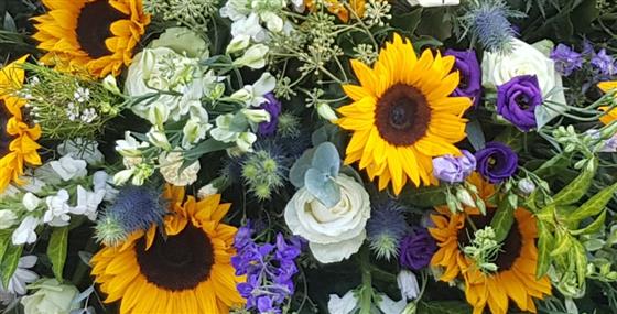 A mix of Sunflowers, purples & Ivories in a garden style.