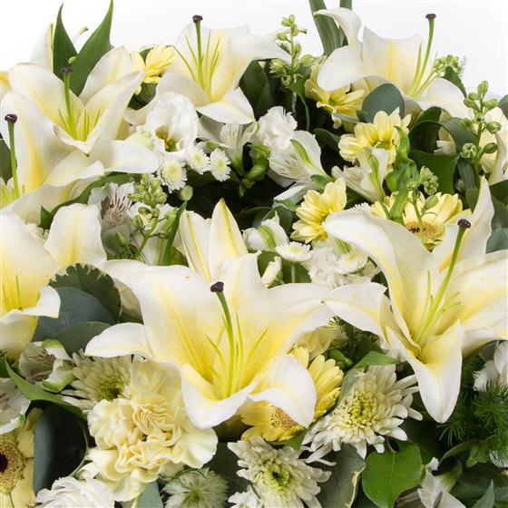 Subtle lemons and creams incorporating lilies and alstromeria combine with delicate solidaster to create this elegant wreath.